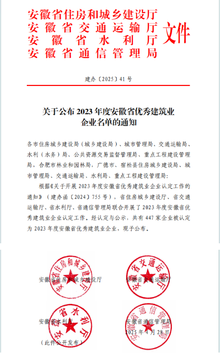 公司获“2023年度安徽省优秀建筑业企业”,近日,安徽省住房和城乡建设厅会同省交通运输厅、省水利厅、省通信管理局联合公布了“2023年度安徽省优秀建筑业企业”名单,公司荣获勘察设计类2023年度安徽省 |
